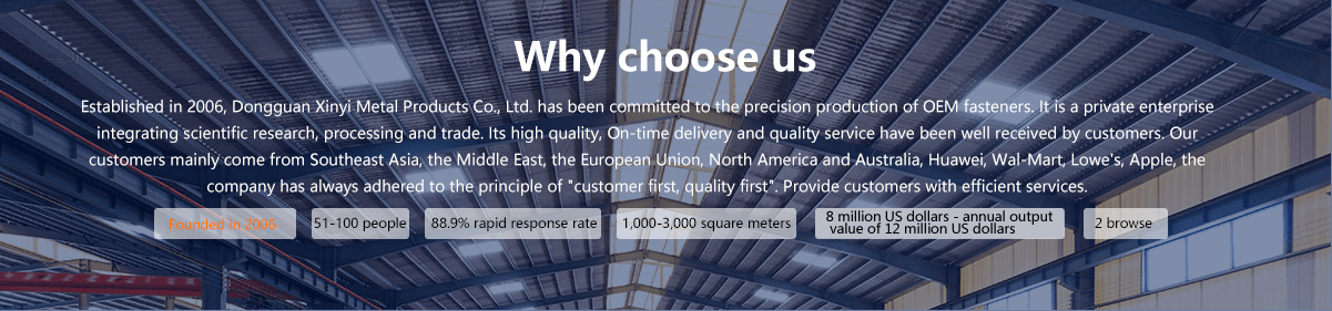 ABOUT USDongguan Kingmo Metal Products Co.,Ltd.,Ltd.was formerly known as Dongguan Qinmao Hardware Co., Ltd. and has 12 years of experience in manufacturing fasteners. As an outstanding hardware fastener manufacturer,implements the requirements of ISO9001.2008 quality management system and ISO14000 environmental management system.Kingmo specializes in producing all kinds of hardware fastener products,especially in the custom production of various......